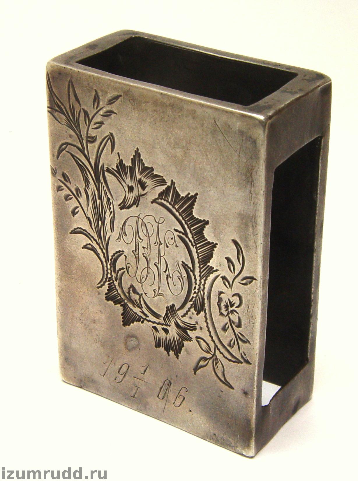 размеры футляра: длинна 59.1 мм, ширина - 39.7 мм, высота - 21.2 мм. вес спичечницы - 28.36 гр. прооизводство - Царская Россия.
