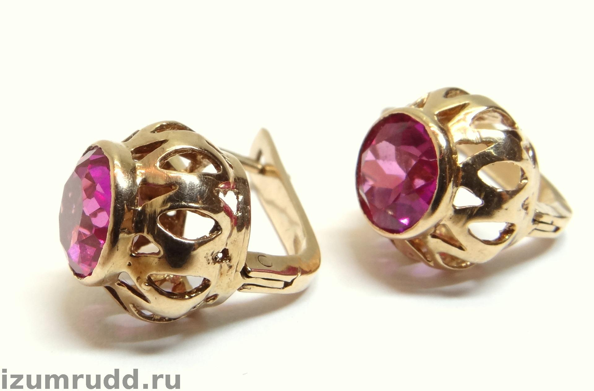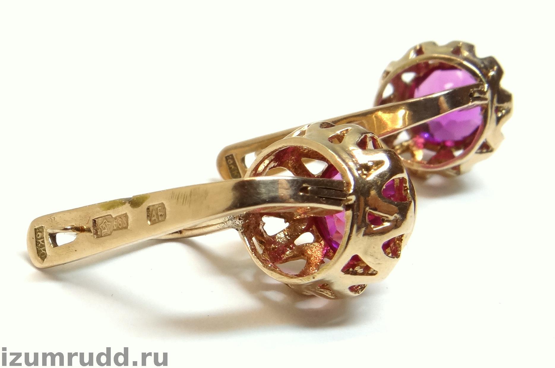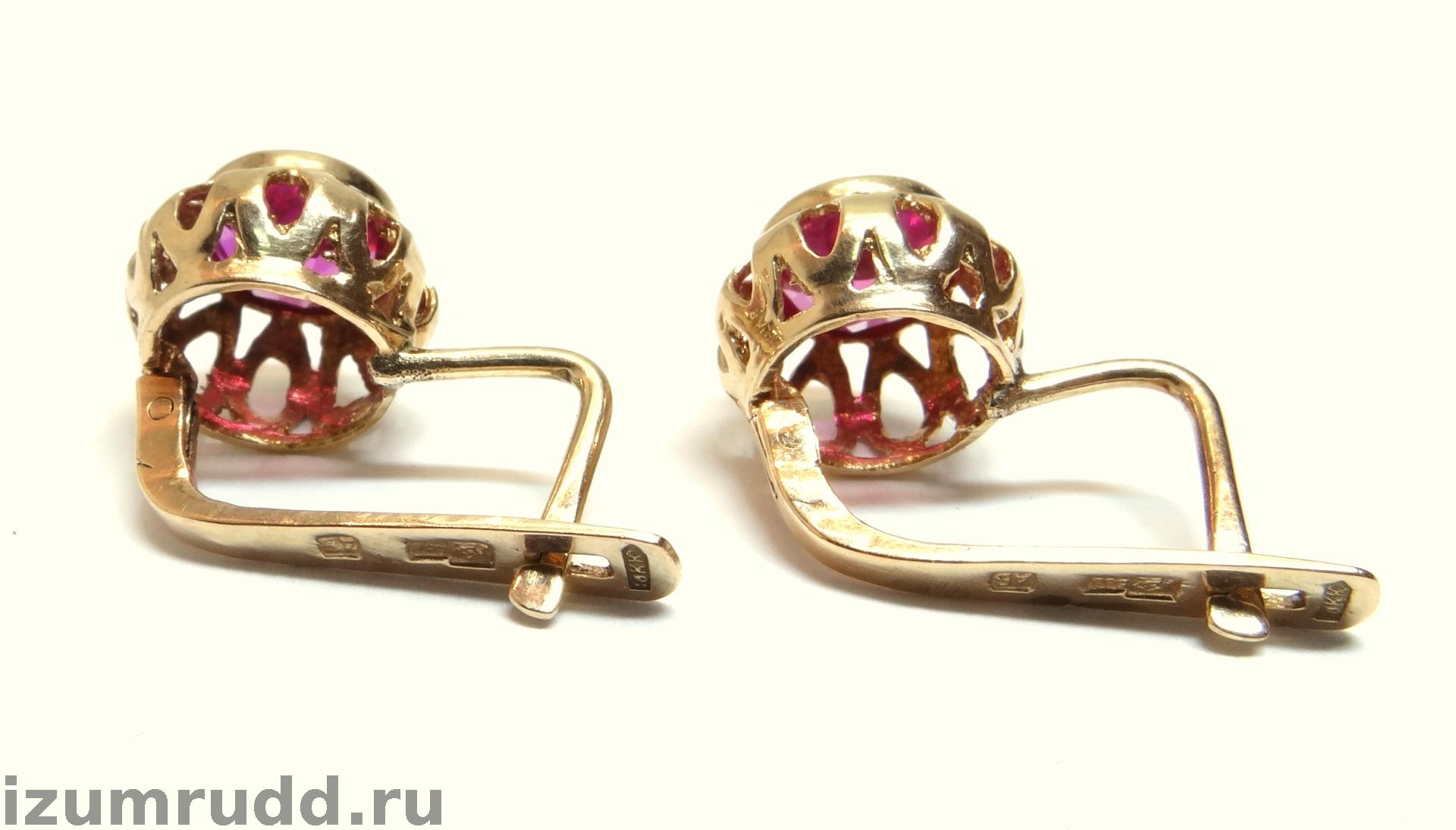 Золотые серьги с синтетическими корундами Советского периода выполнены из розового золота 583 пробы.