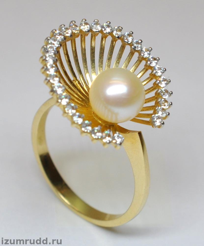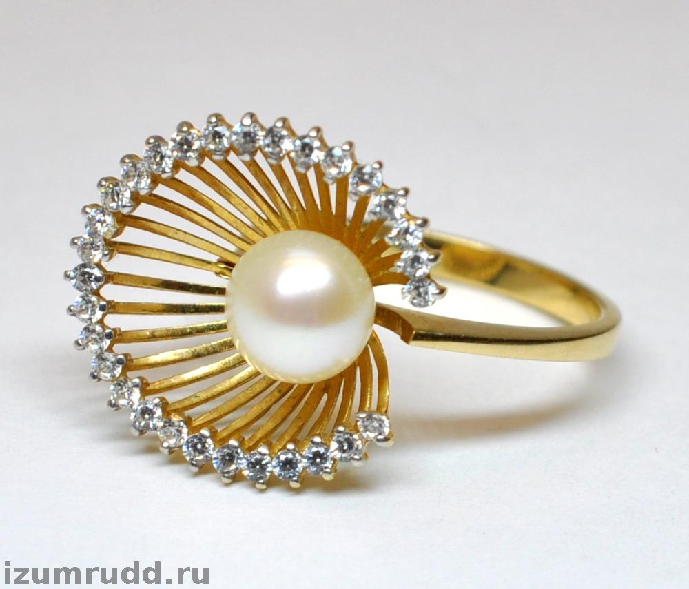 Стильное кольцо с жемчужиной и фианитом 585 пробы