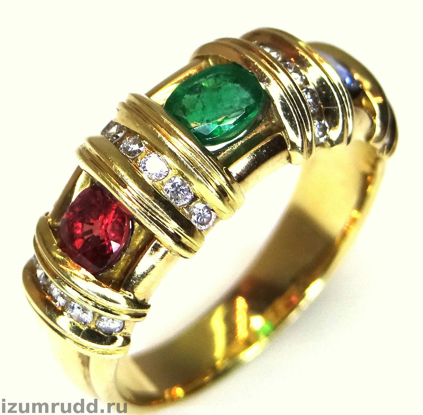 Золотое кольцо рубин, сапфир, изумруд, бриллианты