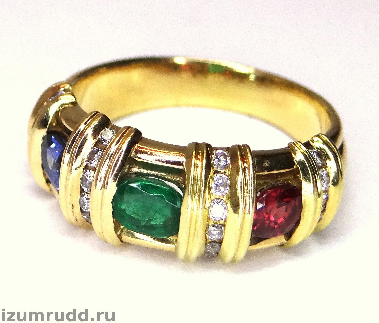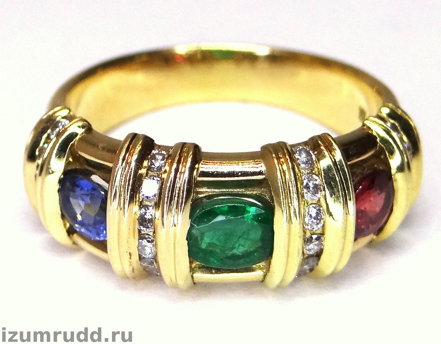 Золотое кольцо рубин, сапфир, изумруд, бриллианты.