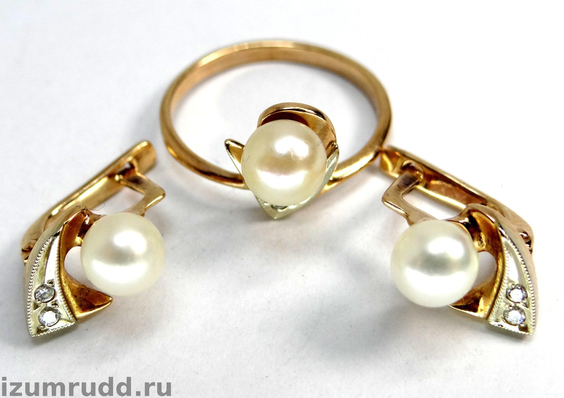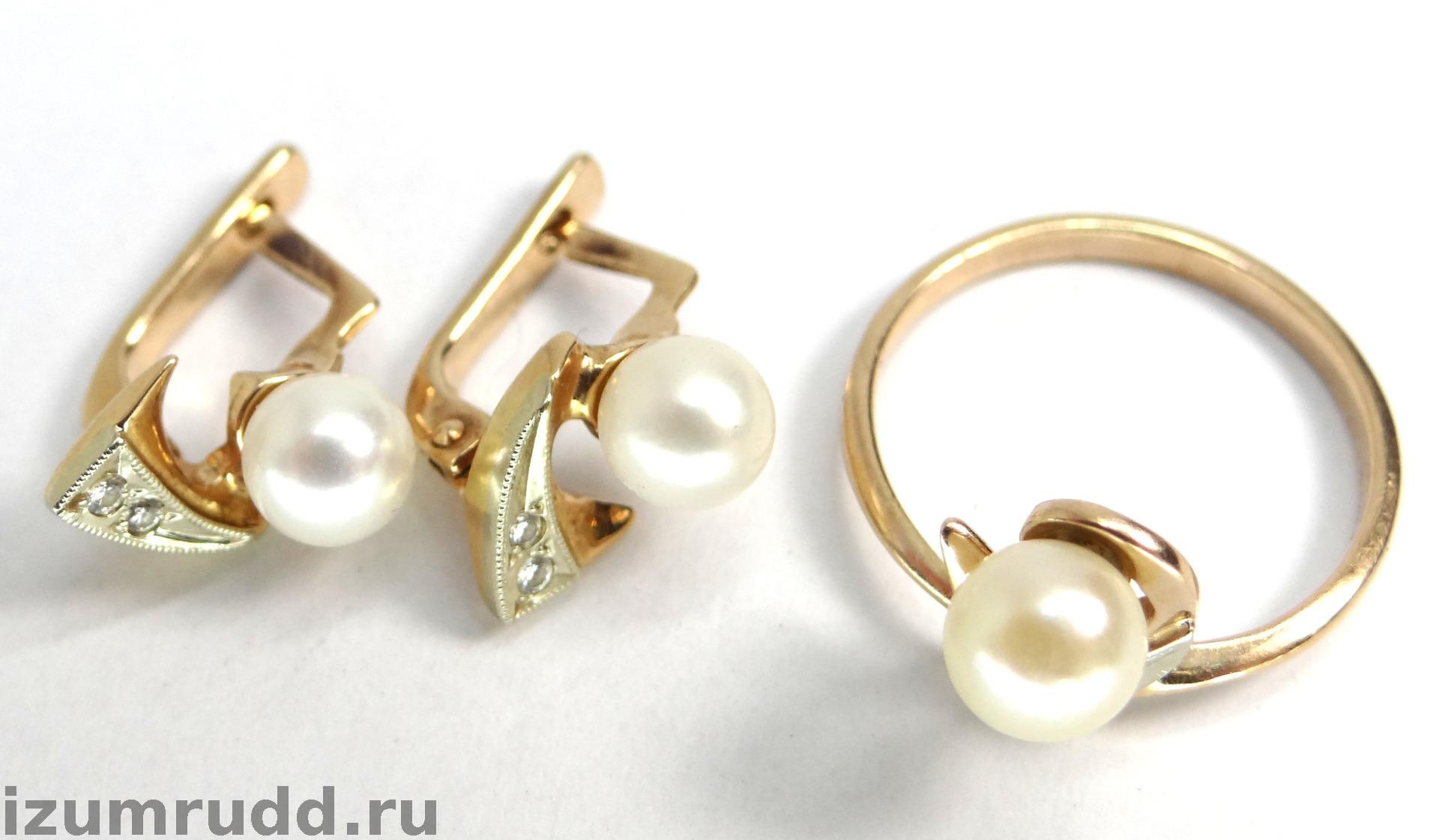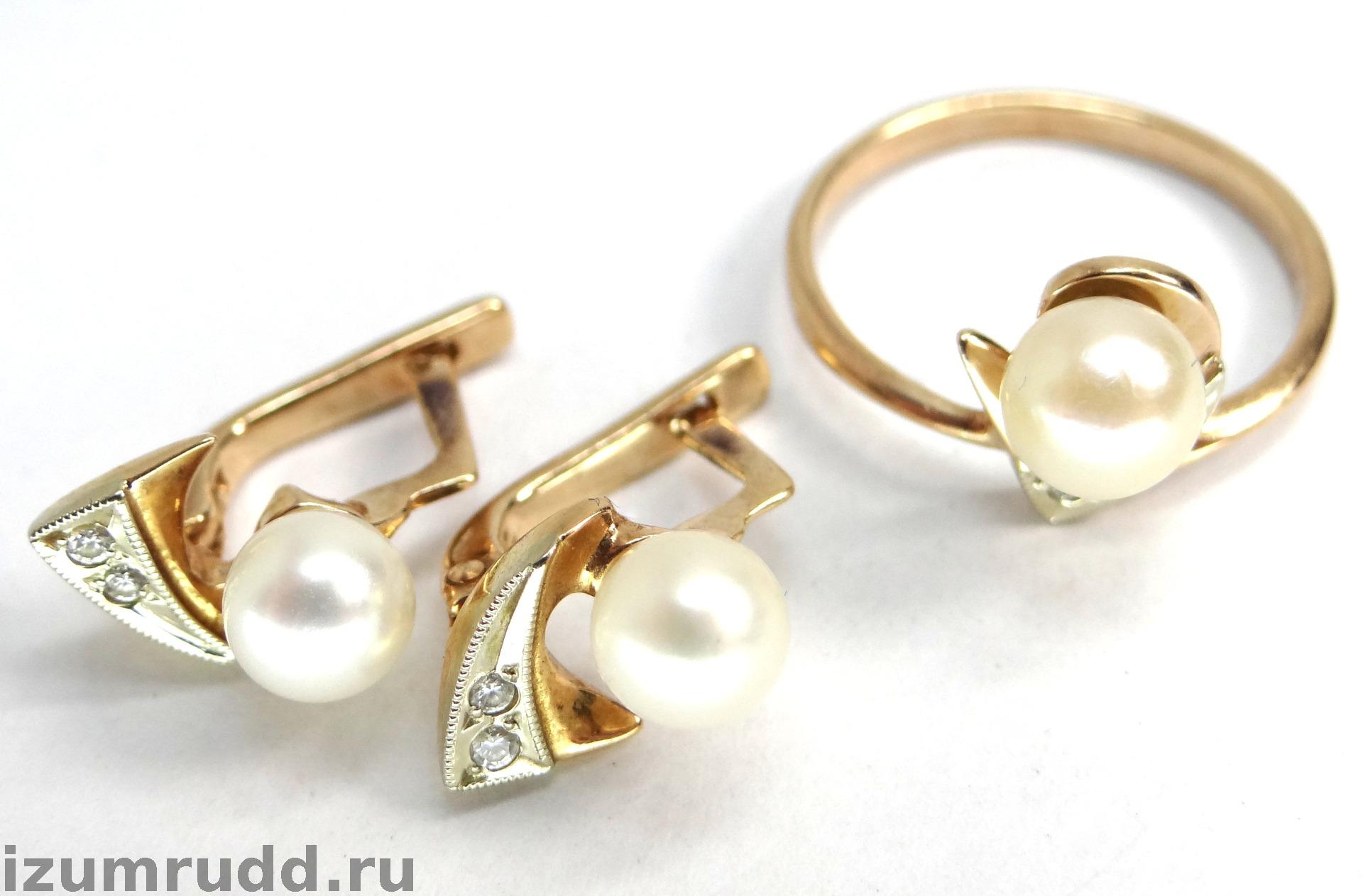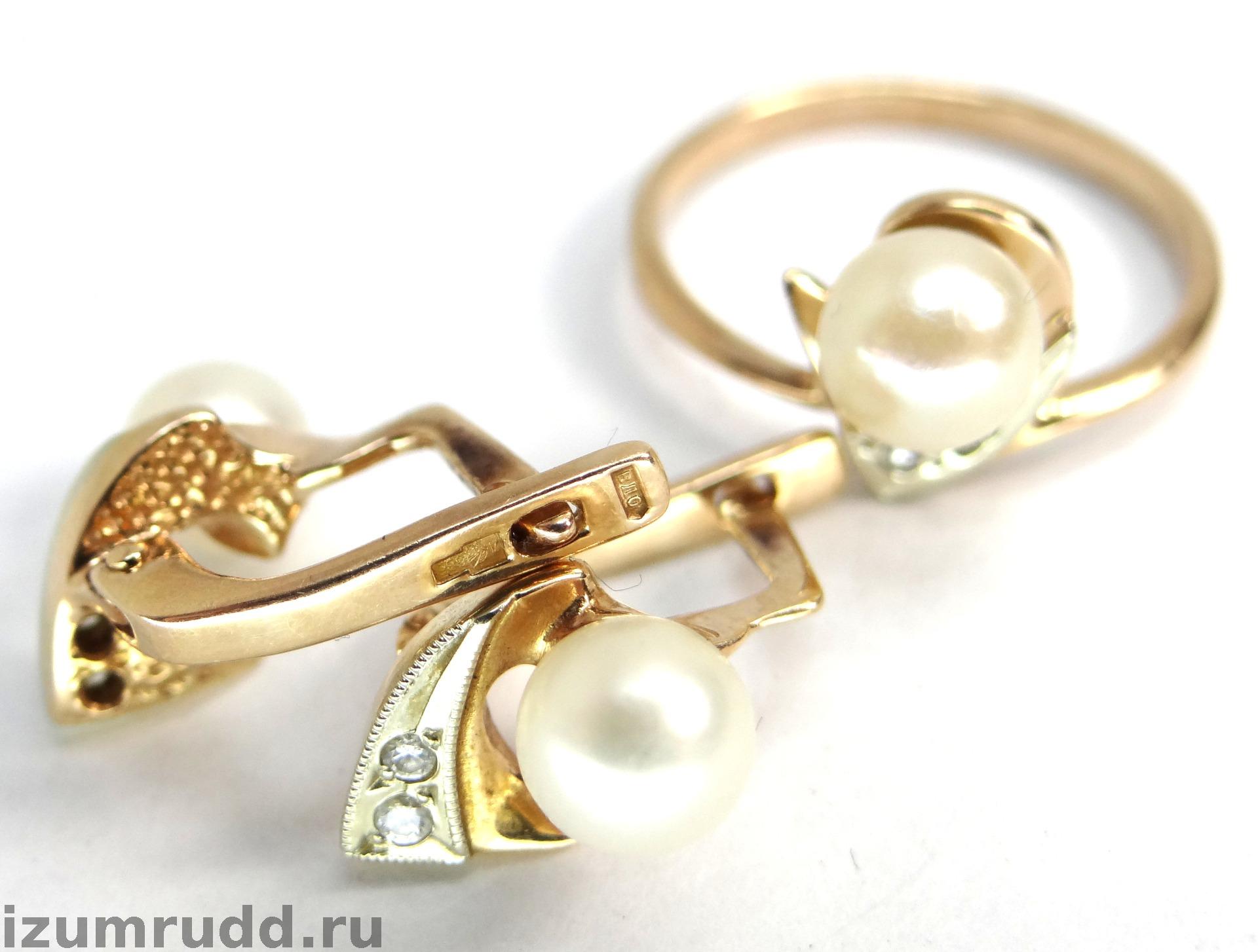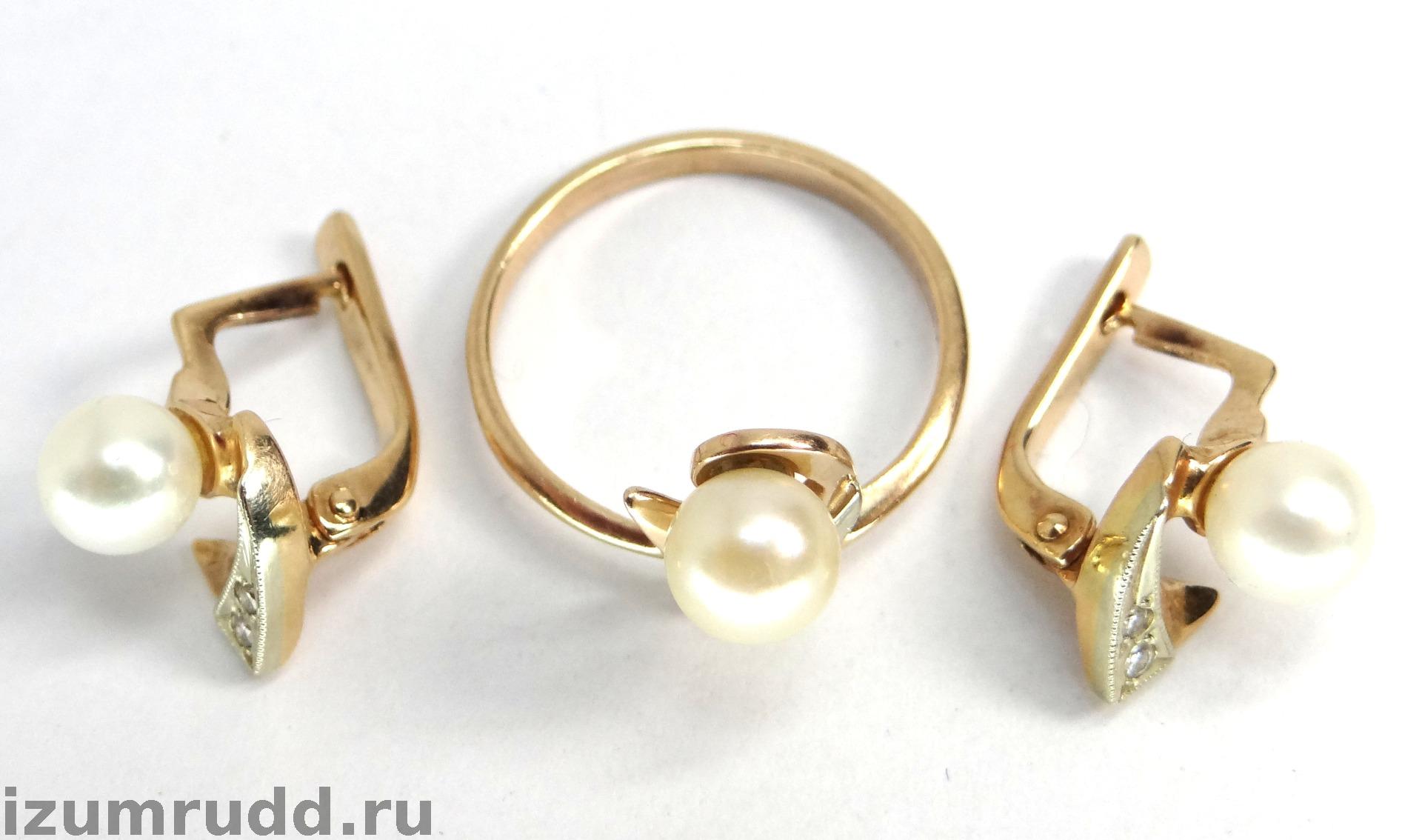 Золотой комплект 585 пробы с жемчугом и бриллиантами.